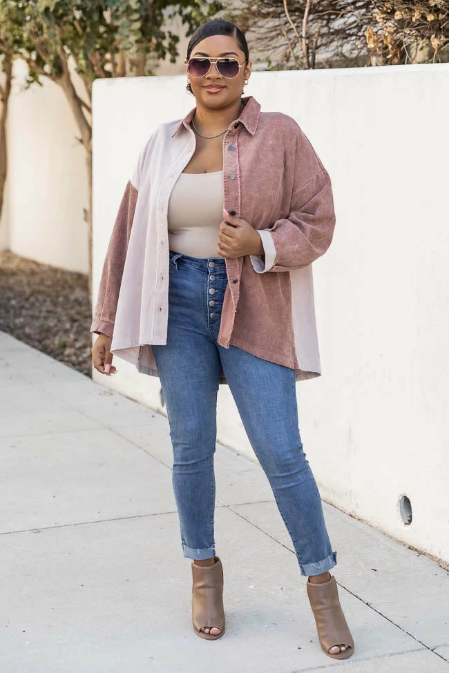 - Collared button down neckline with frayed detailing, long sleeves, and slight high low styleΒ