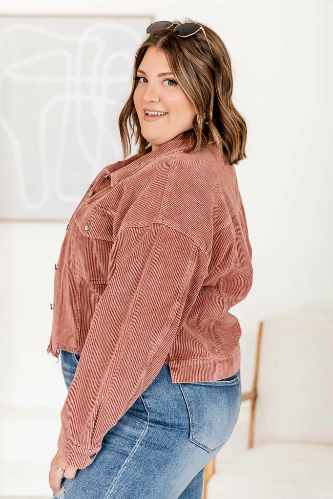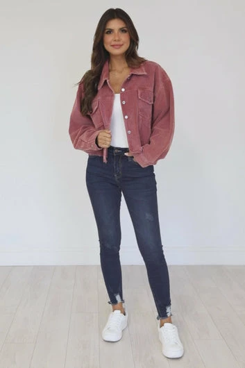 - Long sleeves with a button up front, double pockets, and cropped length with raw hem.