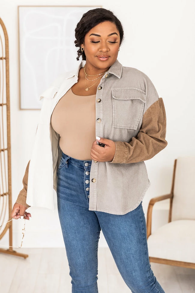 - Long sleeves with a button up front, double pockets, and contrasting colors