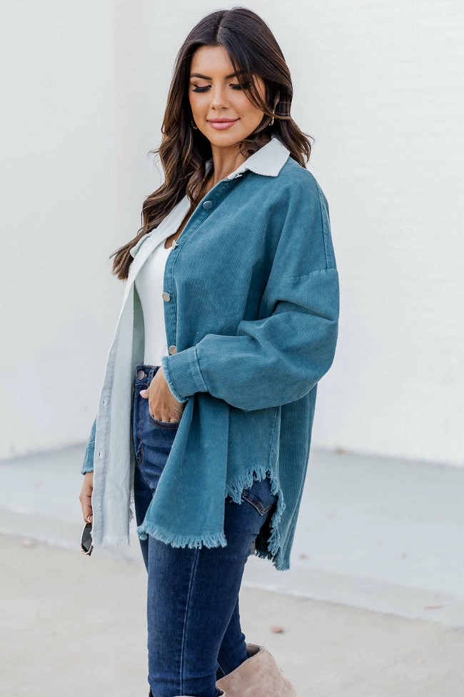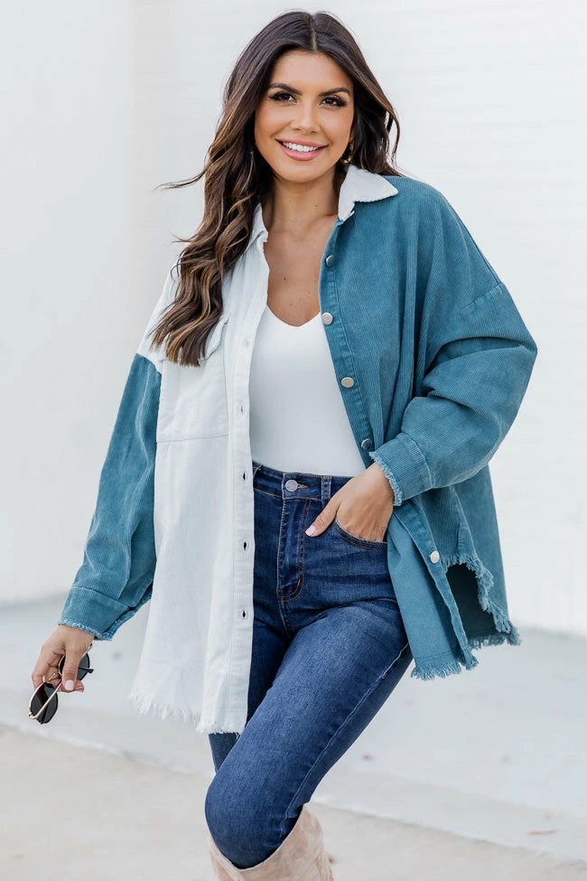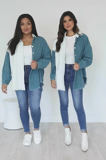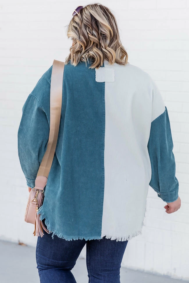 - Collared with button down closure, long sleeves, colorblock design, and frayed hem