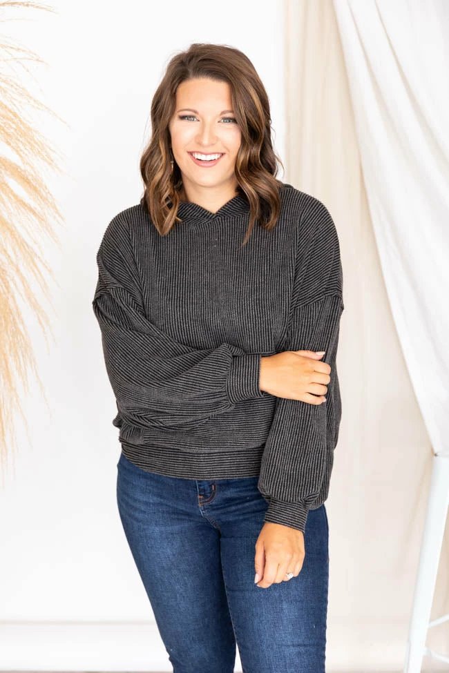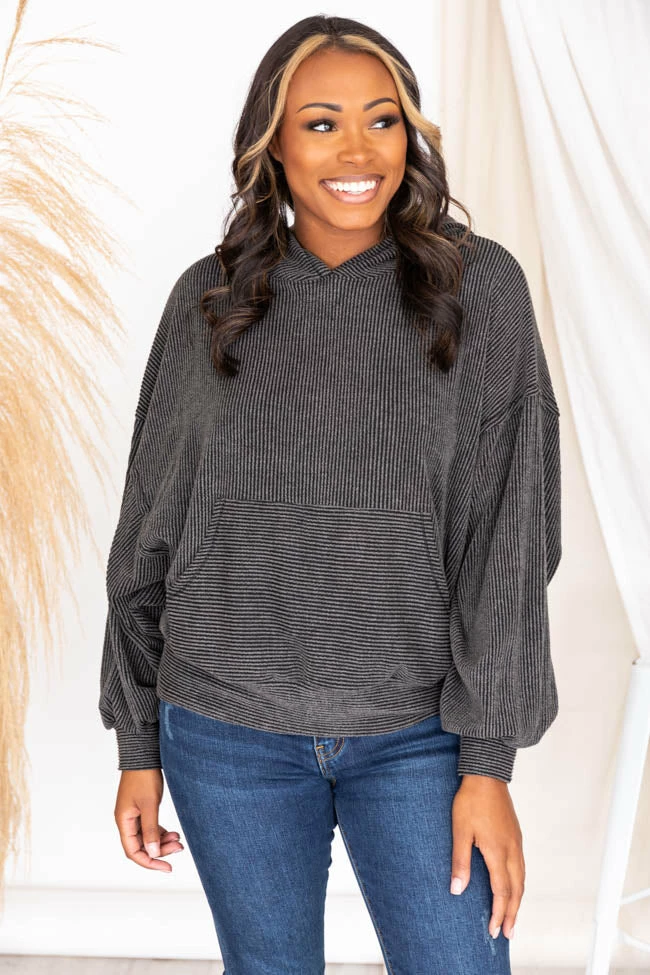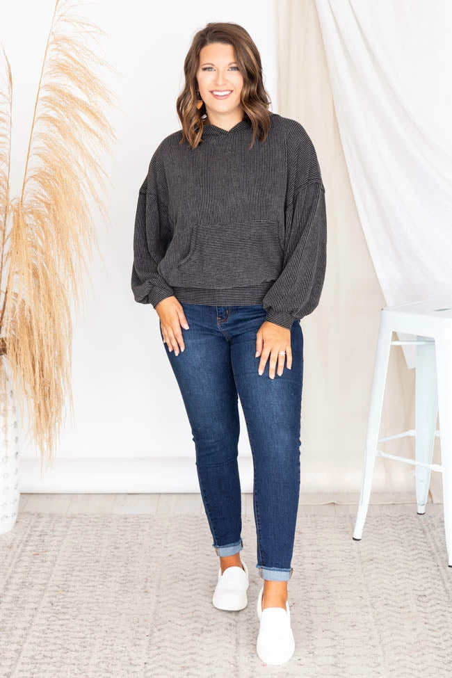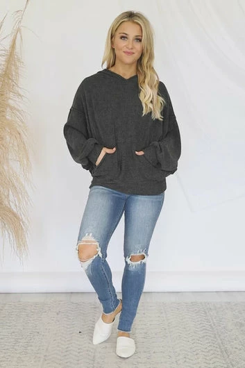 This charcoal hoodie is a must have for chilly summer nights. We love the classic dark neutral color and relaxed fit perfect for lounging in all day long. Plus the dolman sleeves, ribbed fabric, and pocket detail is a must have. You can’t go wrong with adding this piece to your wardrobe. Pair this hoodie with a pair of leggings and sneakers for a stylish look!Β