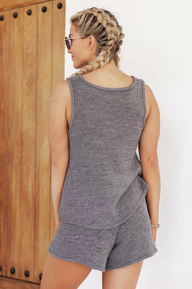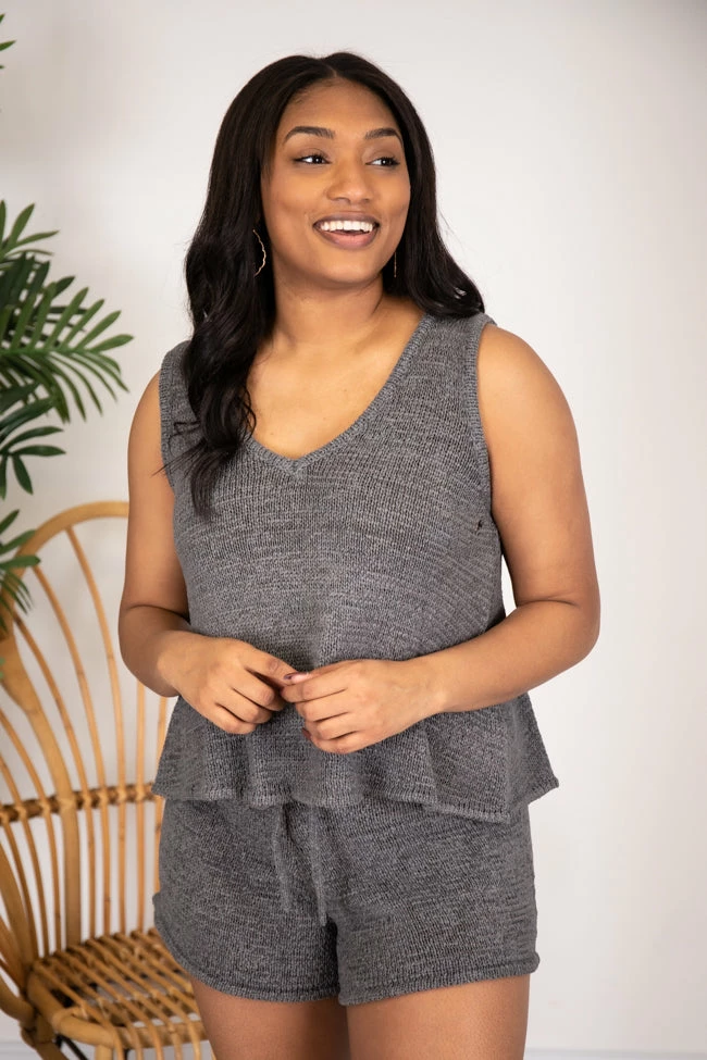 This comfy flowy tank is sure to be a staple in your wardrobe! Featuring a solid charcoal color that is anything but boring. Plus the knit fabric and tank style is so breezy. Wear this fabulous tank with the matching knit shorts or mix it up with jeans for a cute casual day look!